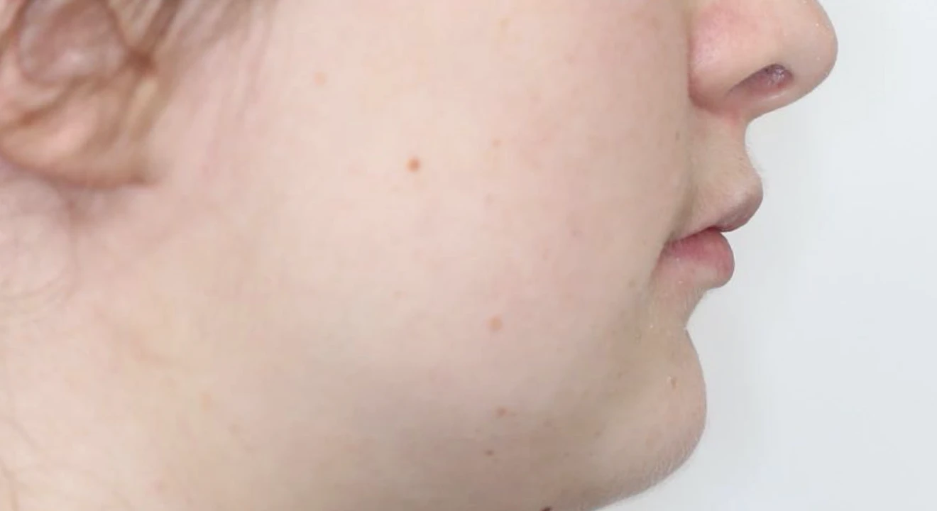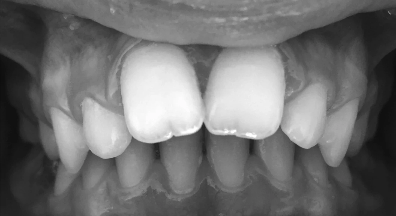 La patiente se présente avec une protrusion de la mâchoire supérieure et un décalage du plan occlusal entraînant une malocclusion esthétique et fonctionnelle. L’analyse clinique et photographique met en évidence un déséquilibre entre les deux arcades et un profil facial peu harmonieux.